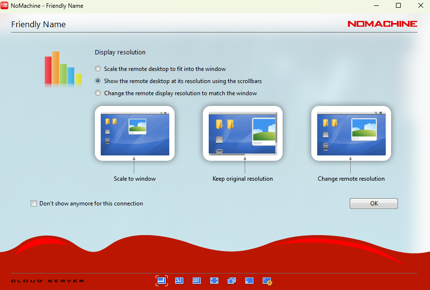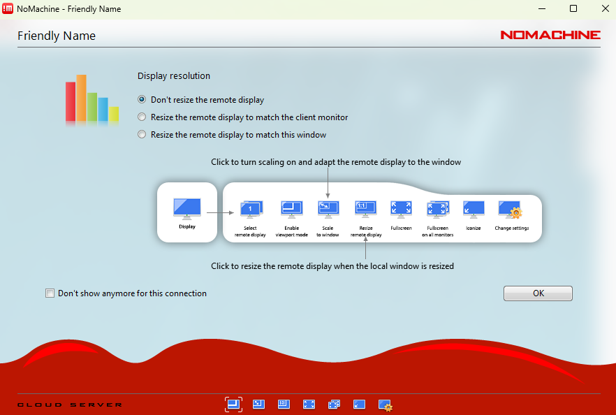 Ctrl + Alt + 0to open the NoMachine menu. From there, select Display → Change settings to adjust the resolution or scaling mode (for example, Fit to window).