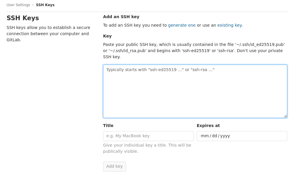 5. In your profile go to settings and on the left-side bar click in SSH Keys and paste the contents of the clipboard in the text box on the top right corner under “Key”